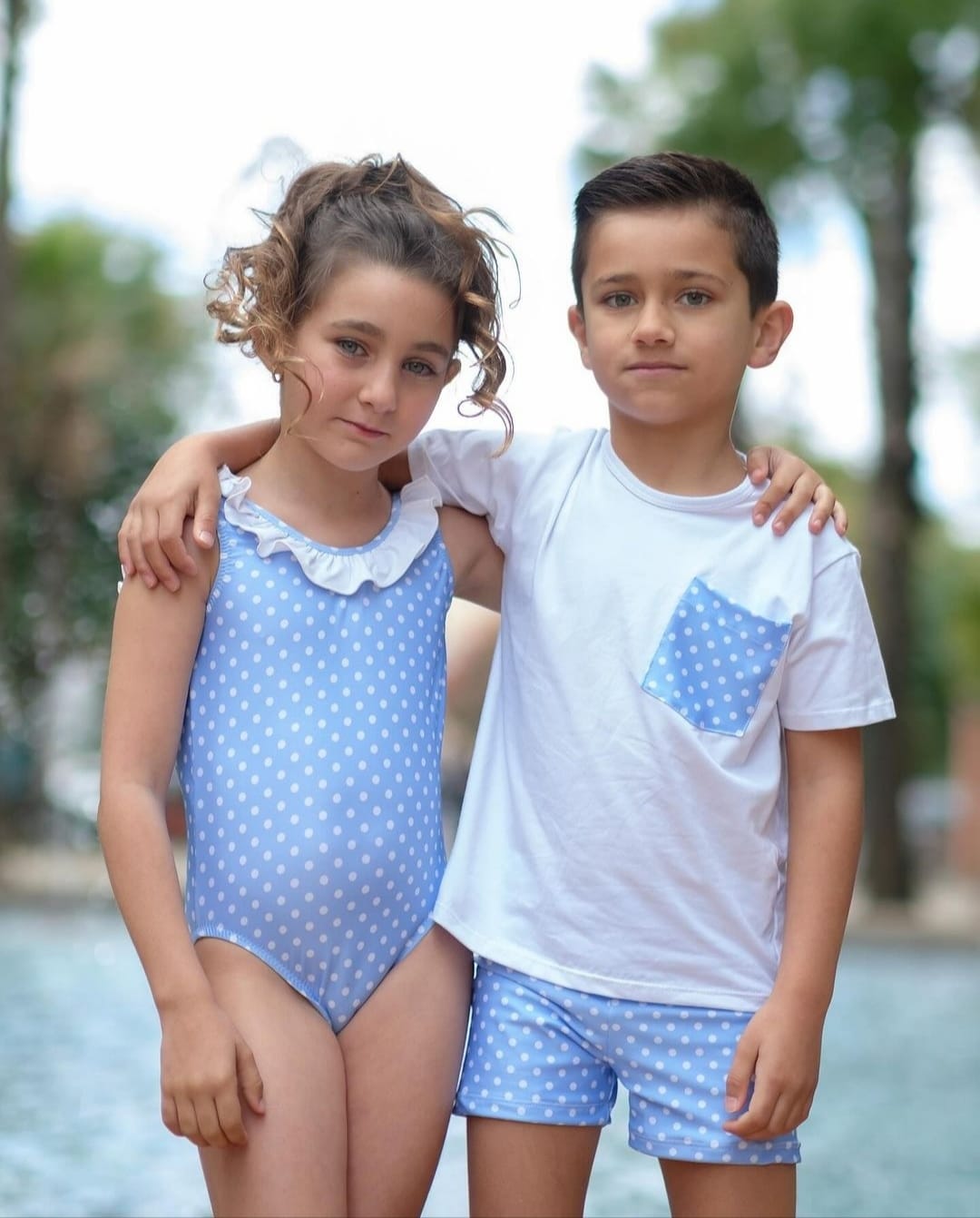 Bañador con topitos para niño en color azul celeste y blancos y camiseta blanca de manga corta en algodón 100% con detalle de topitos a juego con bañador. Composición del bañador 85% poliamida y 15% elastano