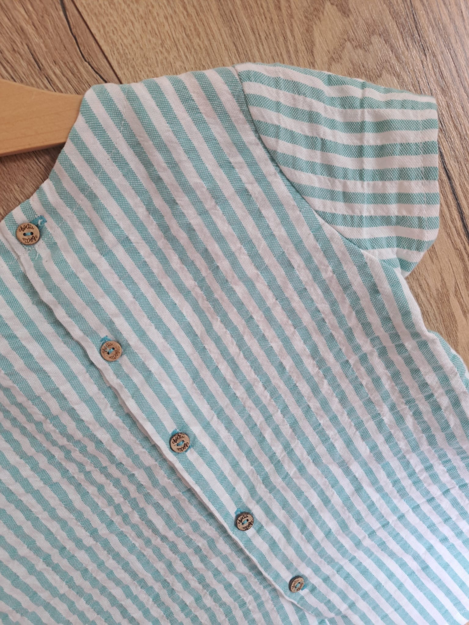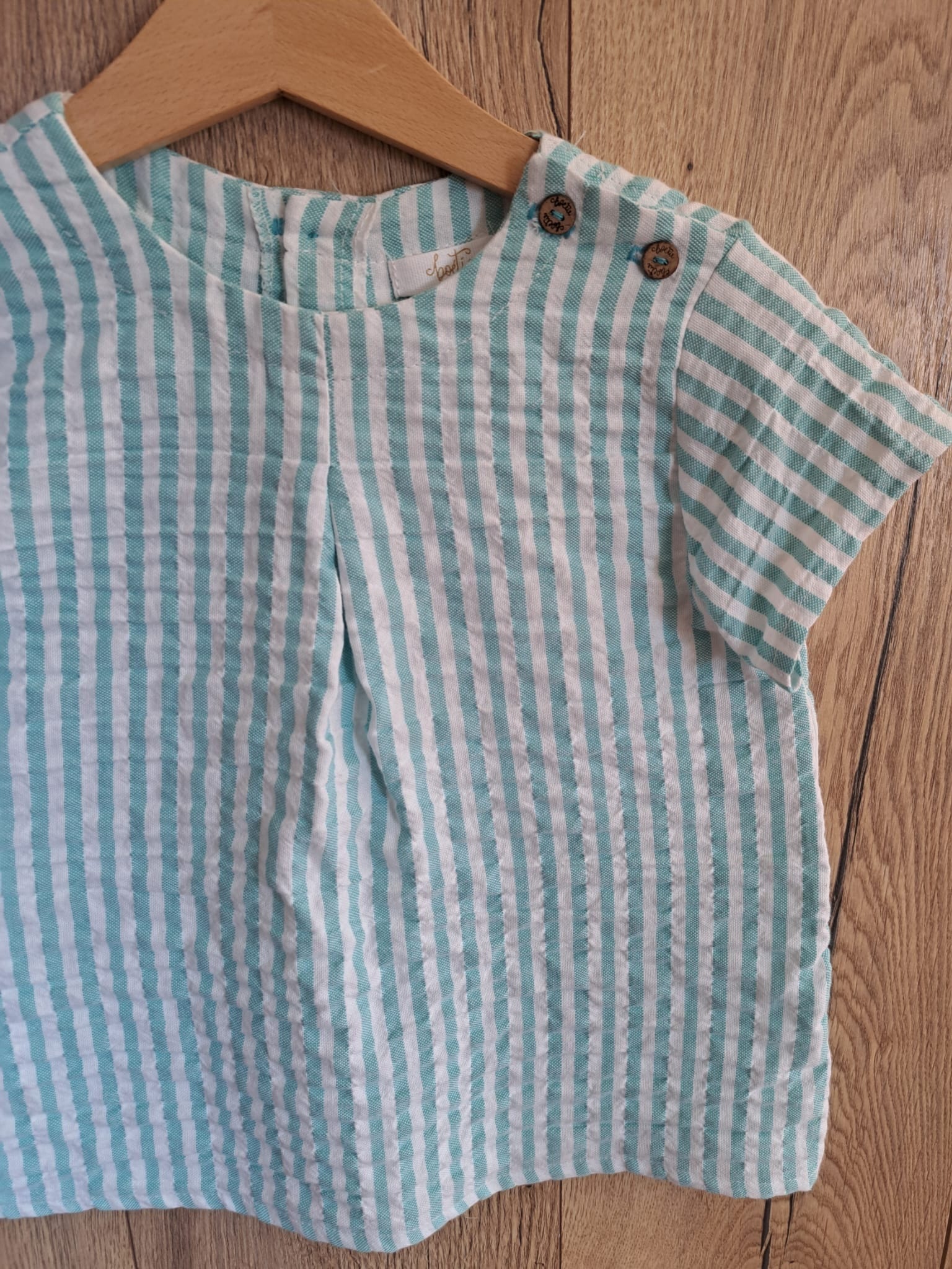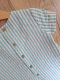 Camisa de niño Rubiel de Boetie kids a rayas verde agua y blanco, de manguita corta con dos botones en el hombro y abotonada en la espalda.