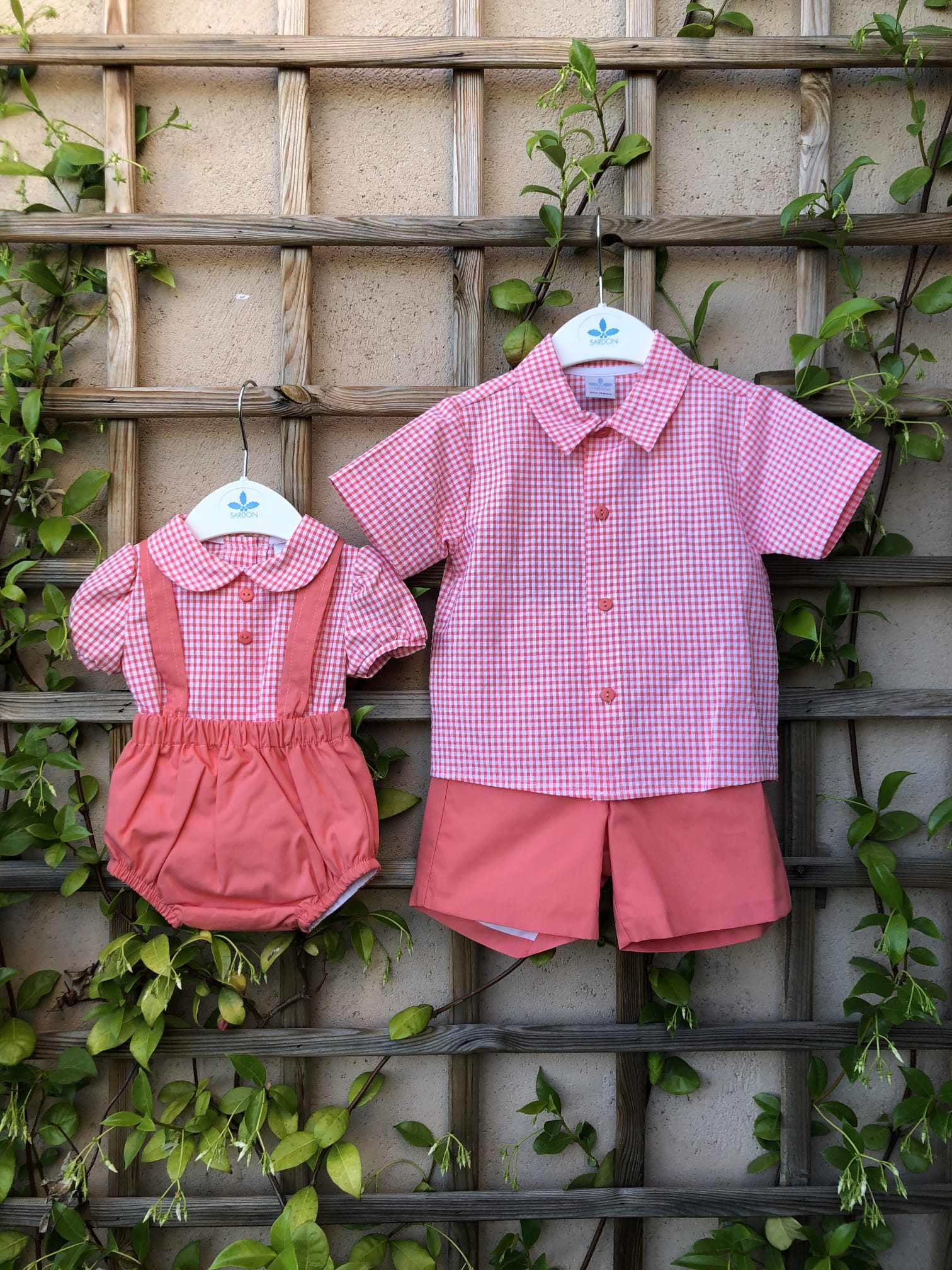 Conjunto bermuda Candela en algodón color coral forrada en su interior a juego con camisa en vichy coral y blanco con manga corta y abotonada en el delantero. Una colección veraniega, elegante, cómoda con la que podrás conjuntar a todos los hermanos.