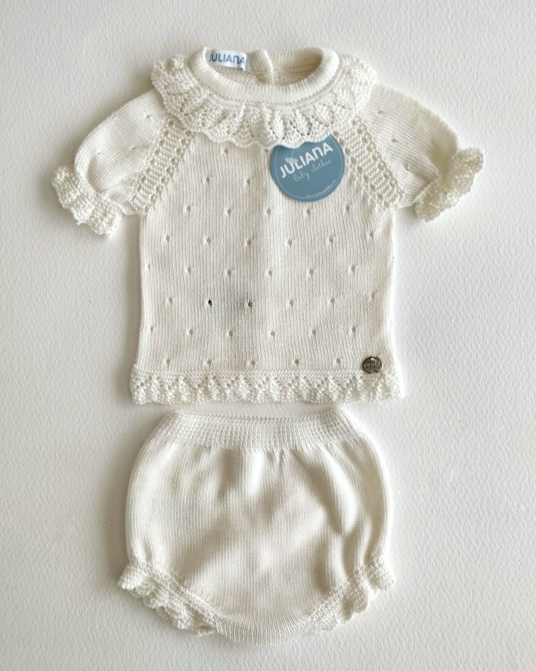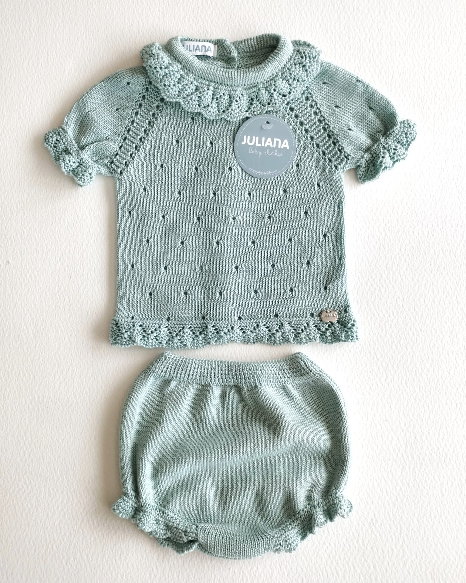 Conjunto de dos piezas en hilo suave y fresquito compuesto por jersey de manguita corta todo calado con remate en cuello y manguitas, abotonado en la espalda a juego con braguita de Juliana vistiendo bebés. Disponible en tres colores verde agua, rosa maquillaje y marfil.