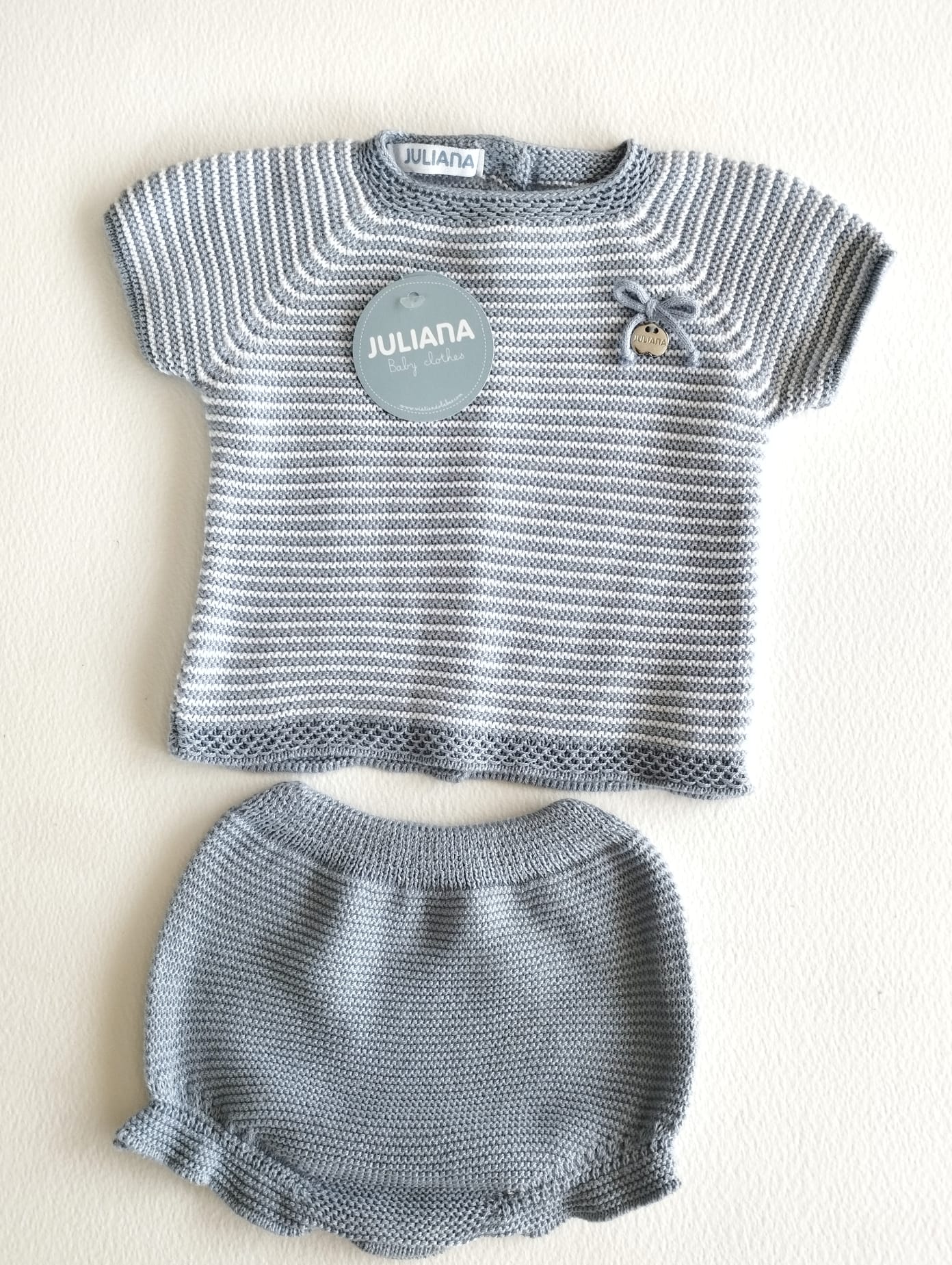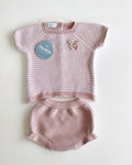 Conjunto de 2 piezas de hilo muy suave, jersey de manguita corta abrochado en la espalda con rayitas y braguita a juego de Juliana vistiendo Bebés. Disponible en tres colores, verde agua, rosa maquillaje y azul cielo.