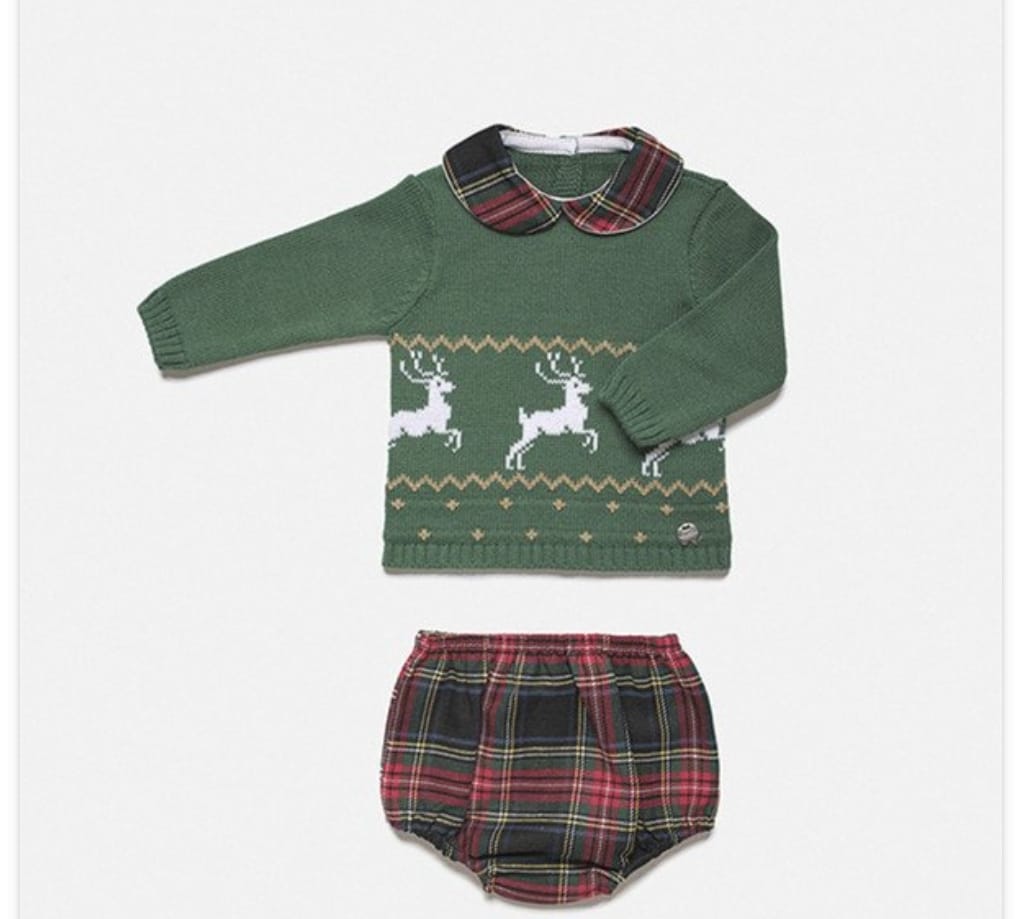 Conjunto de dos piezas jersey de punto con manguita larga en verde musgo con dibujo de renos abotonado en la espalda y cuellito escocés a juego con el pololo de Juliana vistiendo bebés.