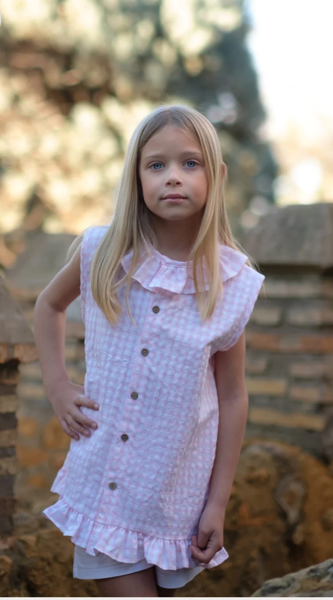 Conjunto vichy de camisa rosa y blanco en algodón orgánico 100% sin mangas, con volante en el cuello y en la parte inferior de la camisa, va abrochada en el delantero con botones y lleva pantalón corto en blanco a juego. Su composición fresquita y su cómodo diseño hacen que sea el conjunto estrella del verano para el día a día.