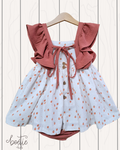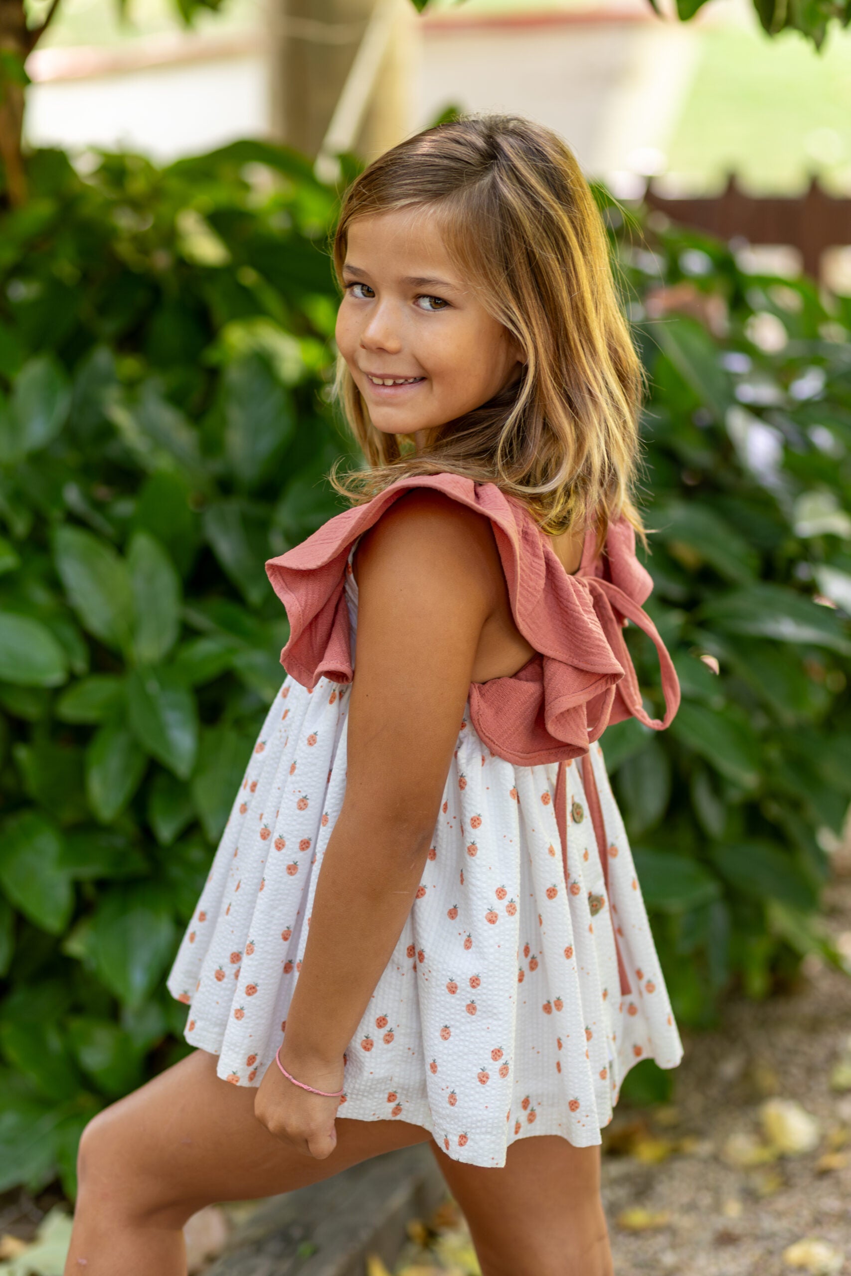 Para coordinar hermanas dispones de Jesusito Nadia baby, short unisex y blusa vuelo marieta.