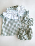 Disponible en esta colección el pelele-vichy-manga-corta-cuello-fruncido a juego, así como el lazo para el pelo en vichy rojo o vichy verde mint.
