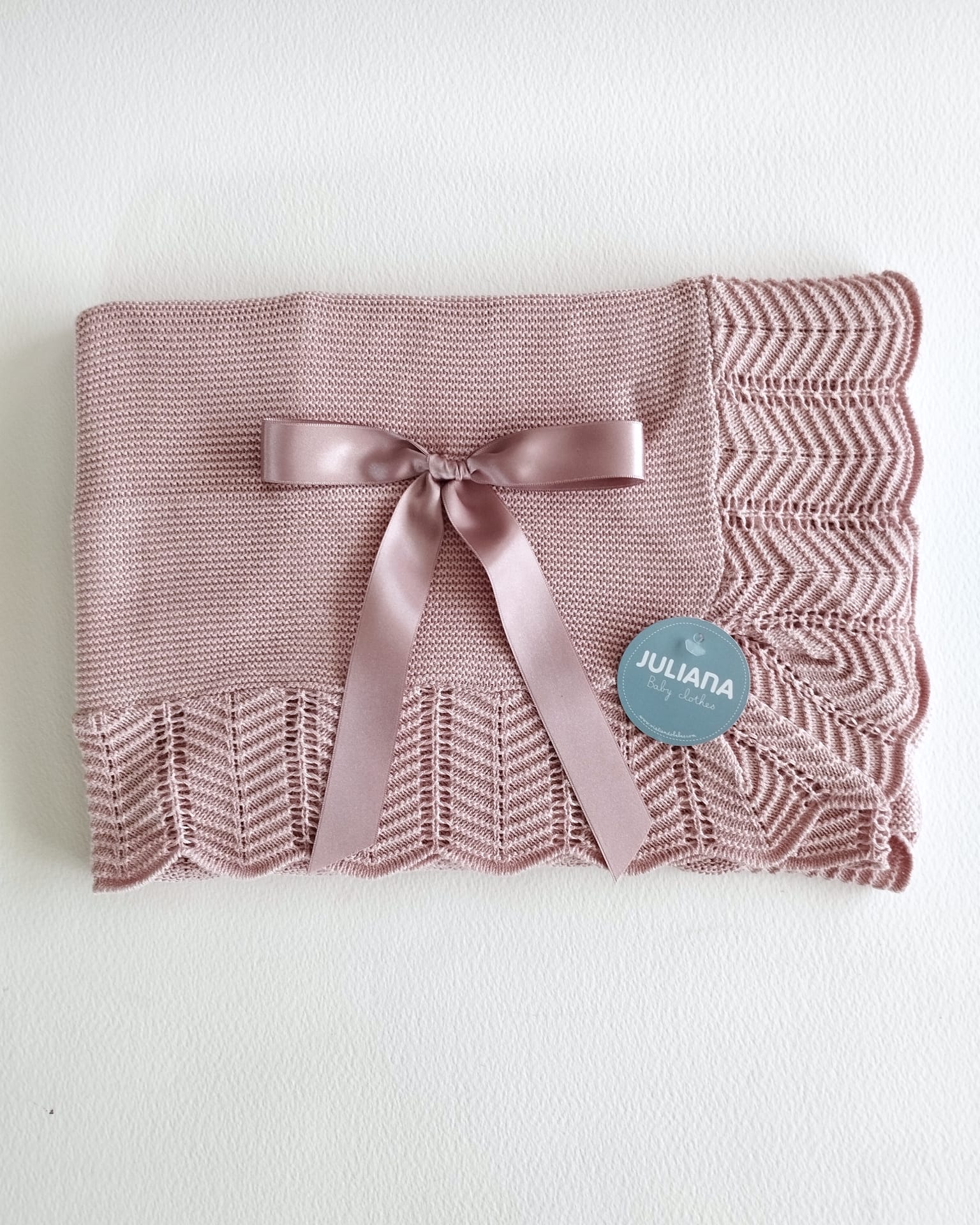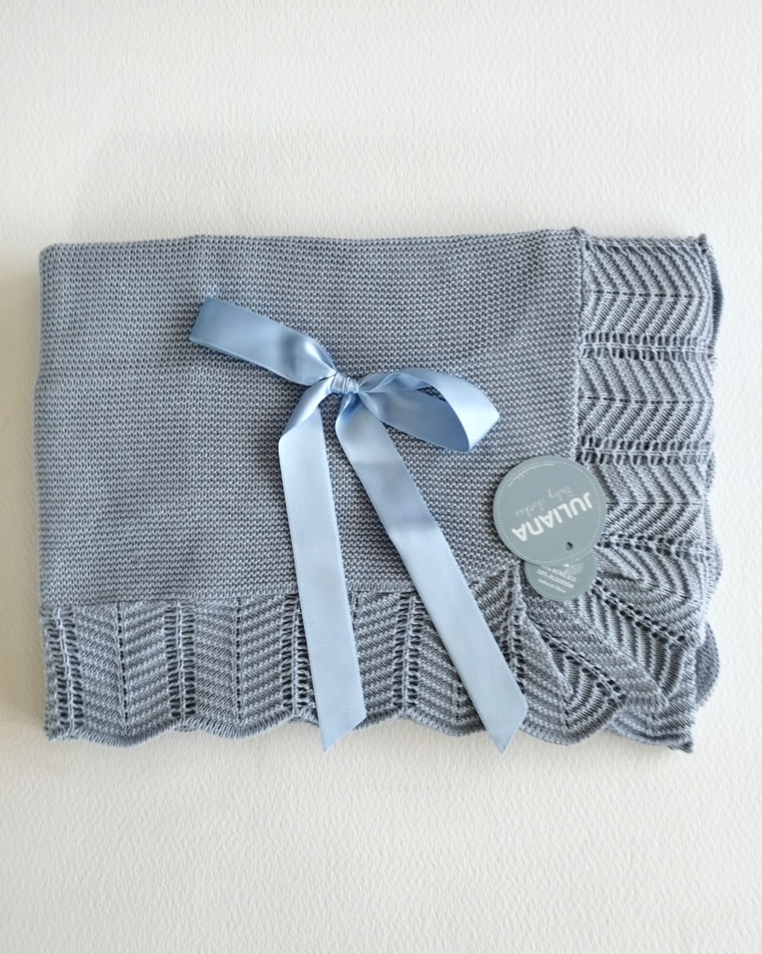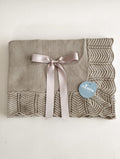 Mantita toquilla muy suave y envolvente lisa con volante en picos de Juliana vistiendo bebés, disponible en azul cielo, maquillaje, beig y blanco.