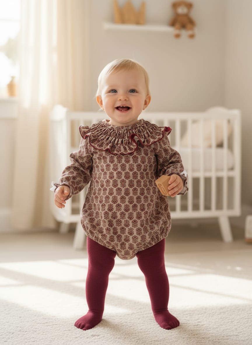 El pelele de la colección Borgoña es pura dulzura en tonos beige y burdeos, con un estampado que evoca tardes otoñales y momentos llenos de ternura.