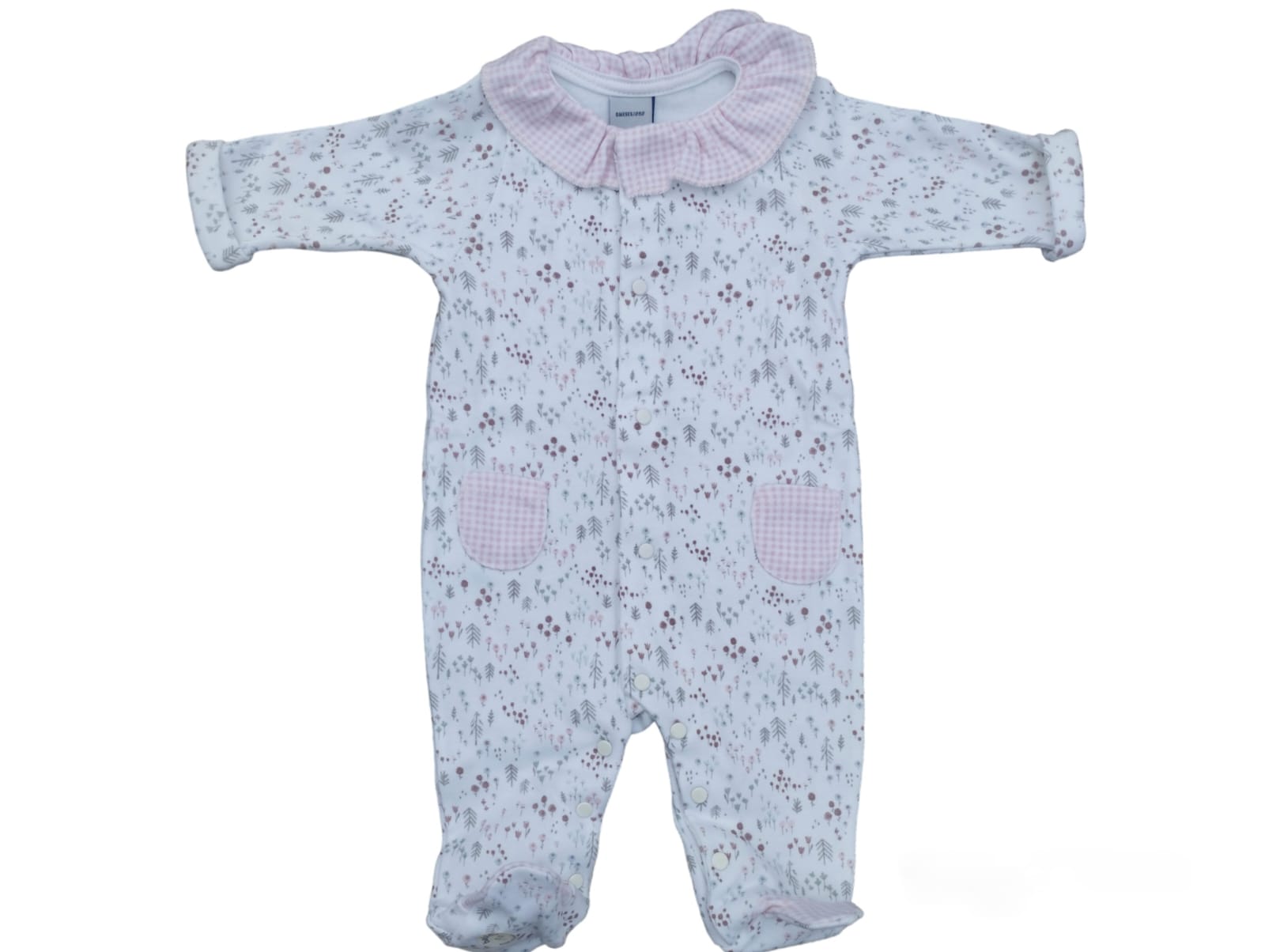 Pelele enterizo con cuello de volante en algodón 100% con abertura delantera y estampado de florecitas rosa con cuello y bolsillitos en el delantero en vichy rosa de la marca Babidú.