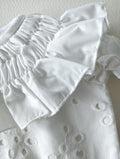 Pelele flor blanco bordado en algodón 100% con cuello fruncido y manga corta, abotonado en la espalda y lleva abertura en la parte inferior para facilitar el cambio de pañal, va forrado en su interior, sin duda una colección de ensueño que podrás combinar con cualquier color.