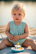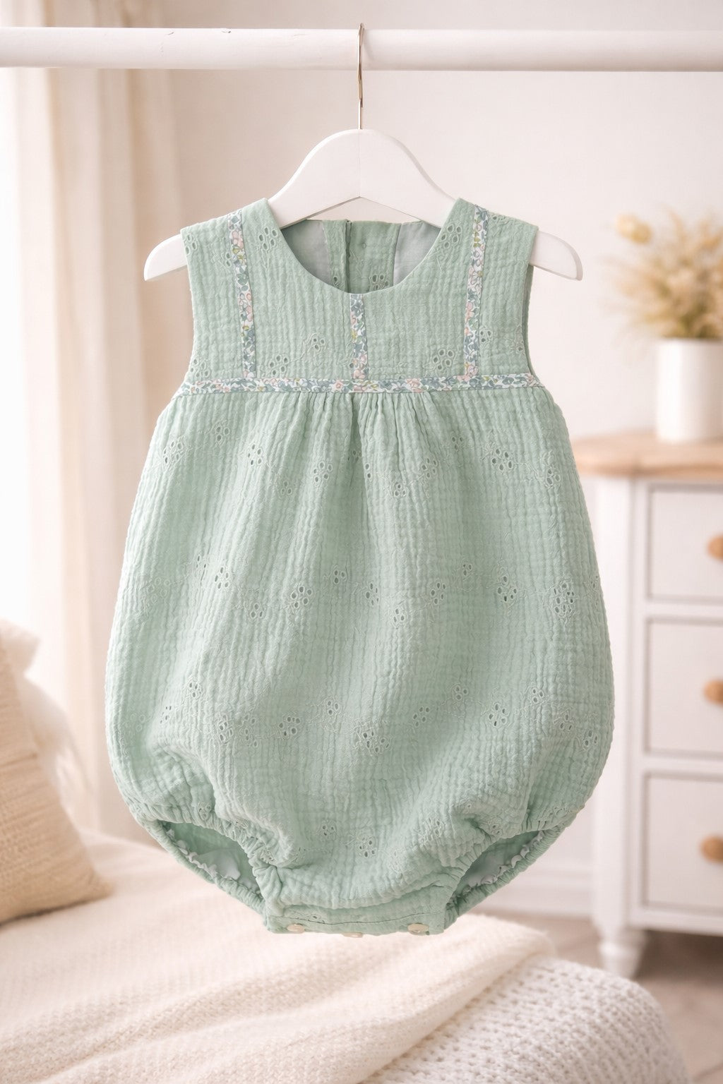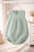 Pelele sin manga en bambula perforada de color verde agua, con detalle de liberti en el delantero en algodón 100% de la marca Pinocho. Abotonado en la espalda y con abertura en la entrepierna para facilitar el cambio de pañal.