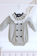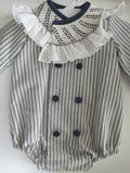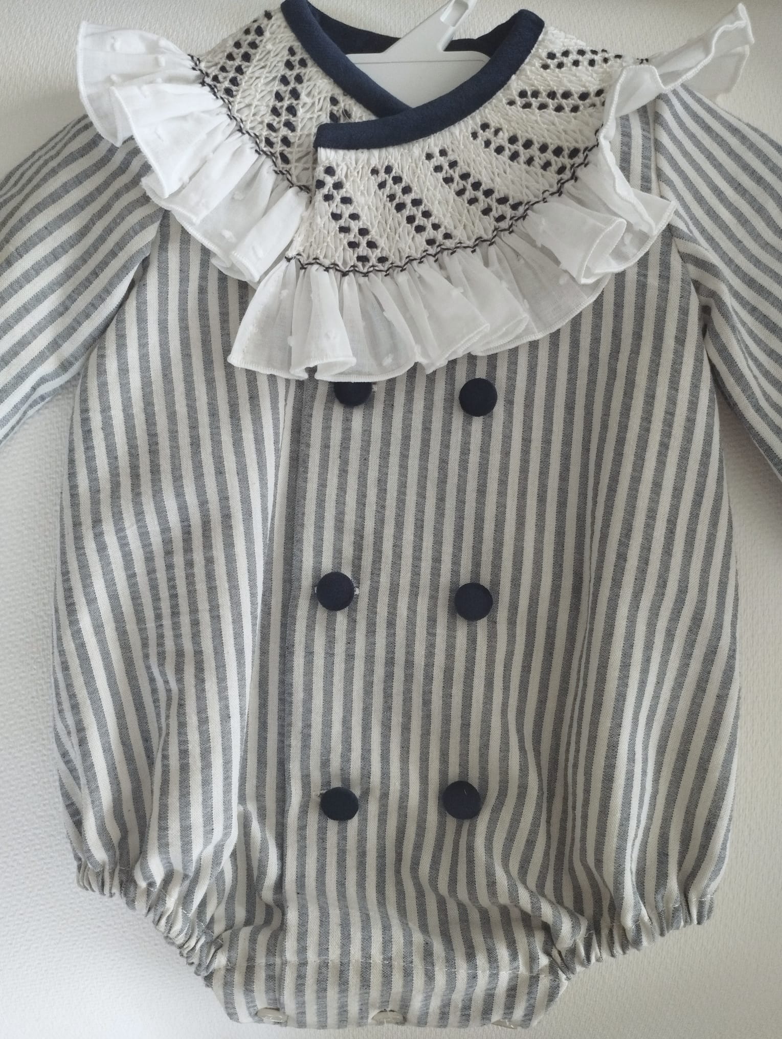 El pelele de rayitas azul marino y blanco roto de la colección Noche es sinónimo de elegancia y dulzura. Su cuello de smock artesanal y los botones forrados en terciopelo azul noche aportan ese toque sofisticado que convierte cada ocasión en un recuerdo inolvidable.
