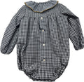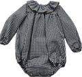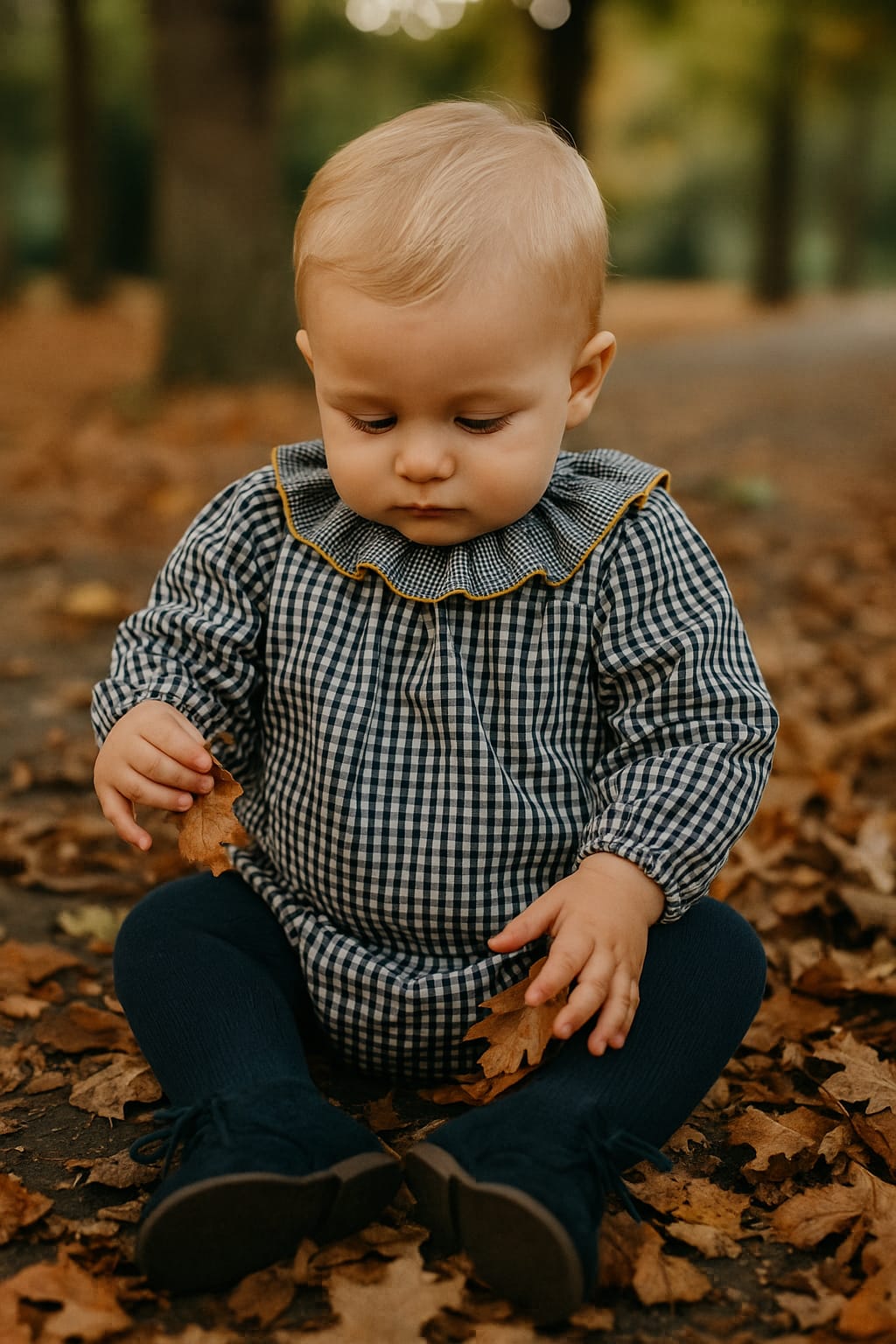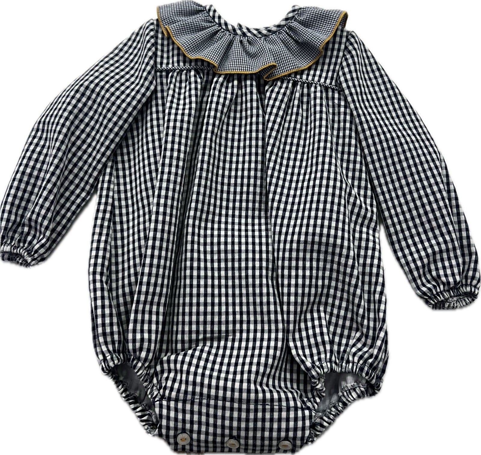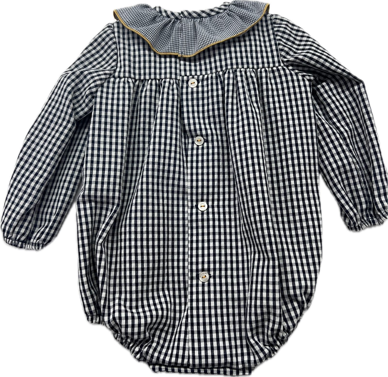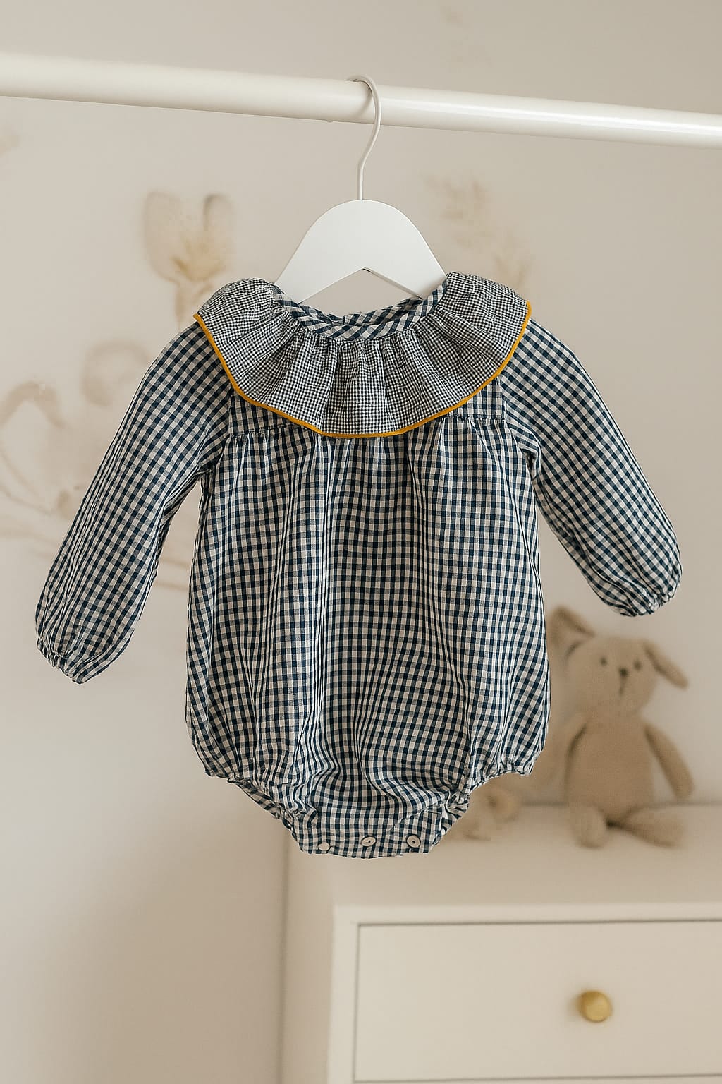 Nuestro pelele Sueños de Vichy está confeccionado en vichy azul marino con cuello voleado en microvichy del mismo tono, un clásico atemporal que nunca pasa de moda. Cada detalle está pensado para aportar la máxima comodidad al bebé sin renunciar a la elegancia.
