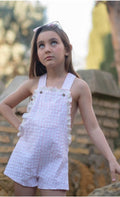 Peto vichy rosa y blanco en algodón 100% orgánico con volantito alrededor del peto y tirantes abrochados en la parte delantera con botones. Ideal para poner con blusita debajo o así tal cual para ir más fresquita.