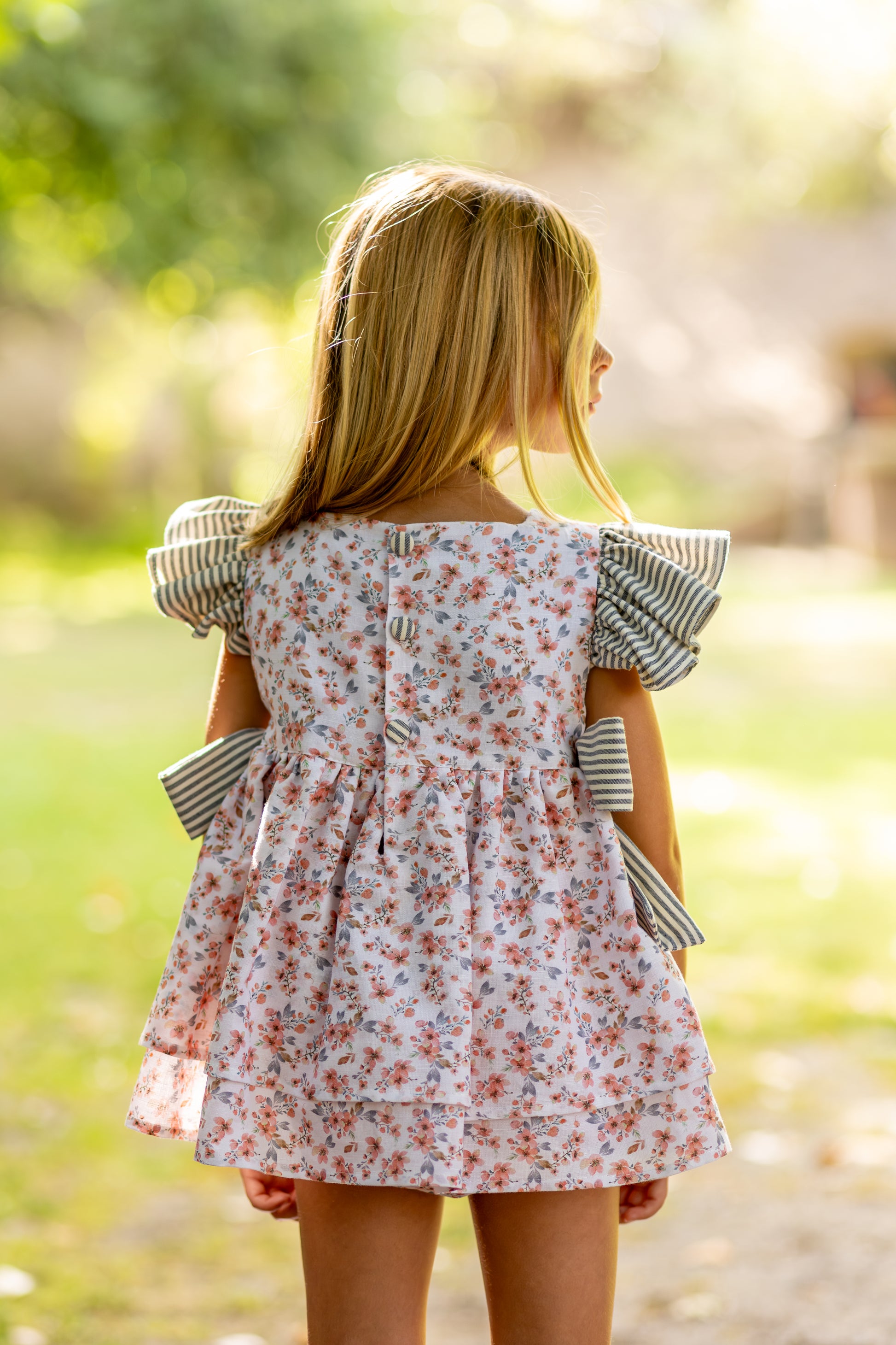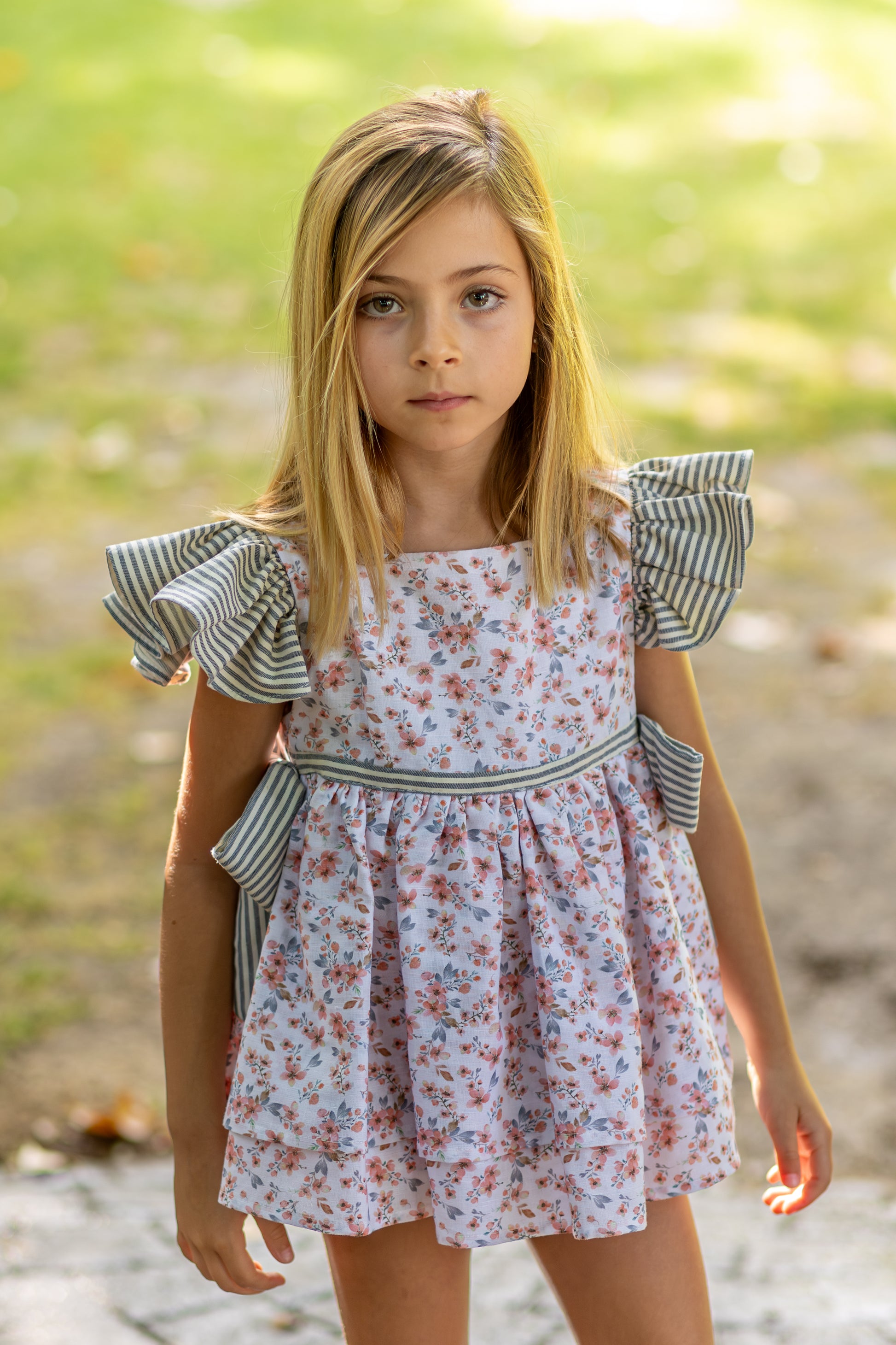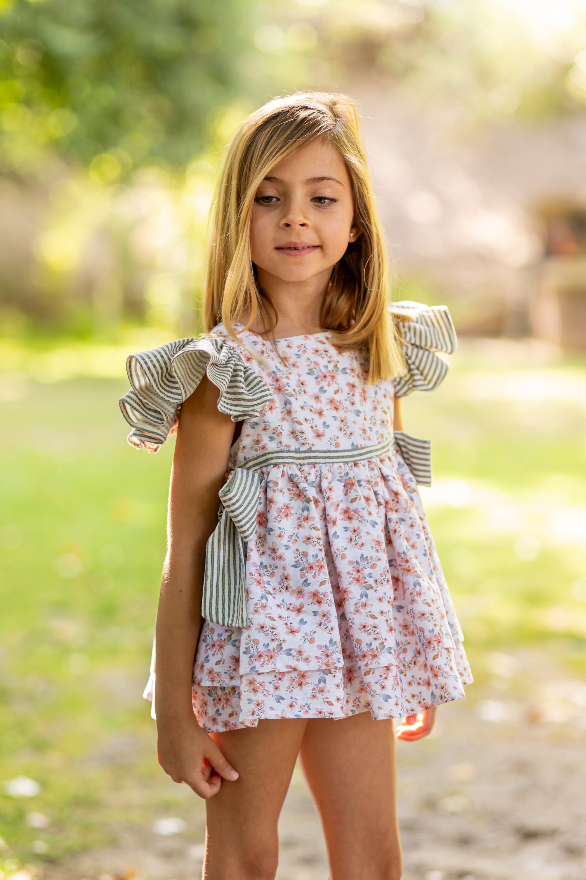Para coordinar hermanos dispones de Blusa flores , Short para niña, camisa rayas Enora y short para niño