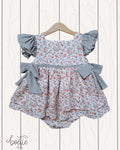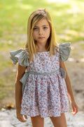 Ranita abotonada en la entrepierna de Boetiekids con estampado de flores y manguita mariposa con rayas verdes a tono.