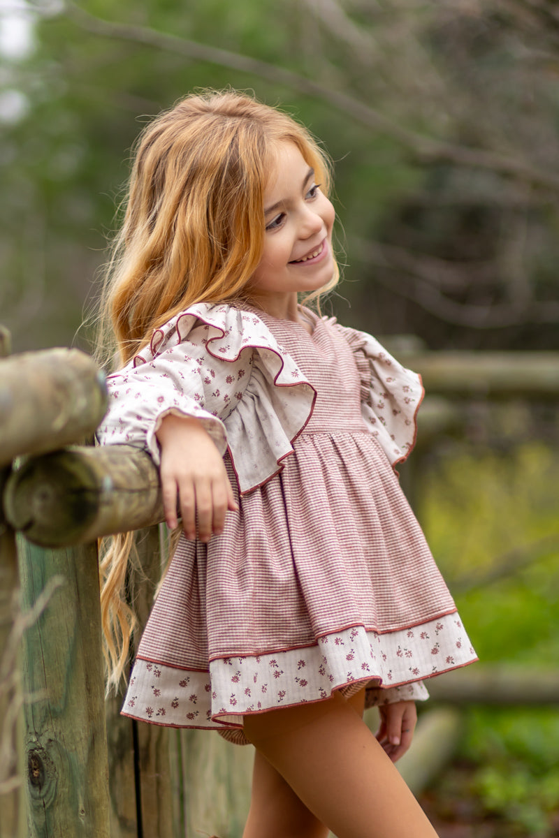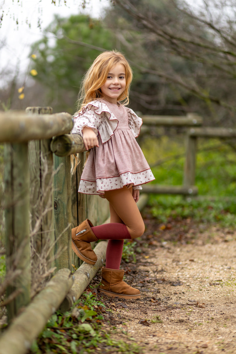 Ranita Telva de Boetiekids, en vichy color teja oscuro con tirante ancho y rematada con volantito en el costado, lleva sobrefaldita de vuelo con franja de florecitas en la parte inferior combinable con la blusa Telva, se venden por separado. Un conjunto 10, que hará brillar este otoño-invierno a nuestras niñas.