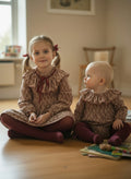 El vestido de la colección Borgoña es pura fantasía en tonos beige y burdeos, con un estampado que recuerda a los paseos entre hojas doradas y tardes de juegos en familia. Su cuello fruncido de quita y pon, rematado en suave terciopelo a juego, permite transformar el look según la ocasión: elegante para una celebración, desenfadado para el día a día.
