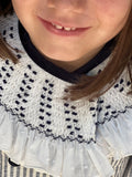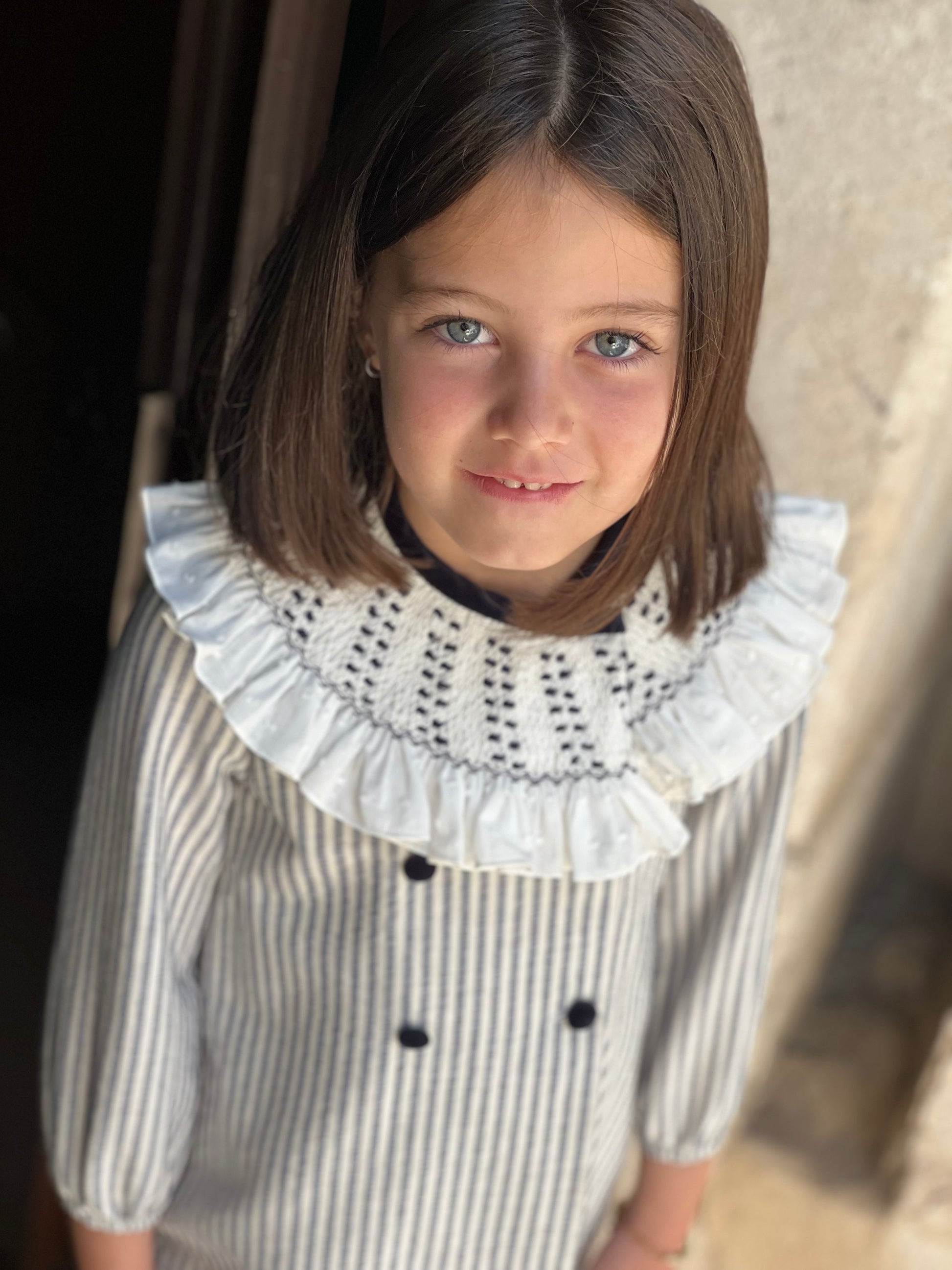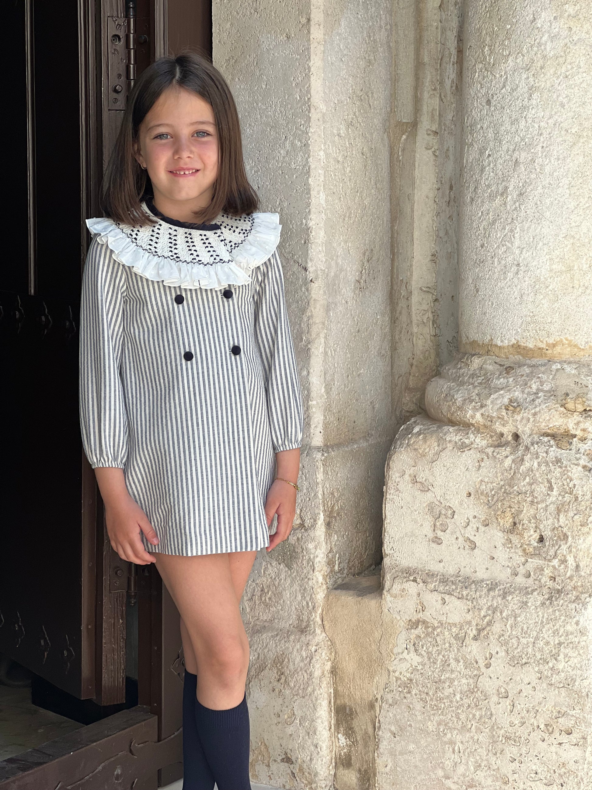 Este vestido de rayitas azul marino y blanco roto, con su delicado cuello de smock artesanal y botones forrados en terciopelo azul noche, es la esencia de la elegancia y el encanto infantil.