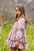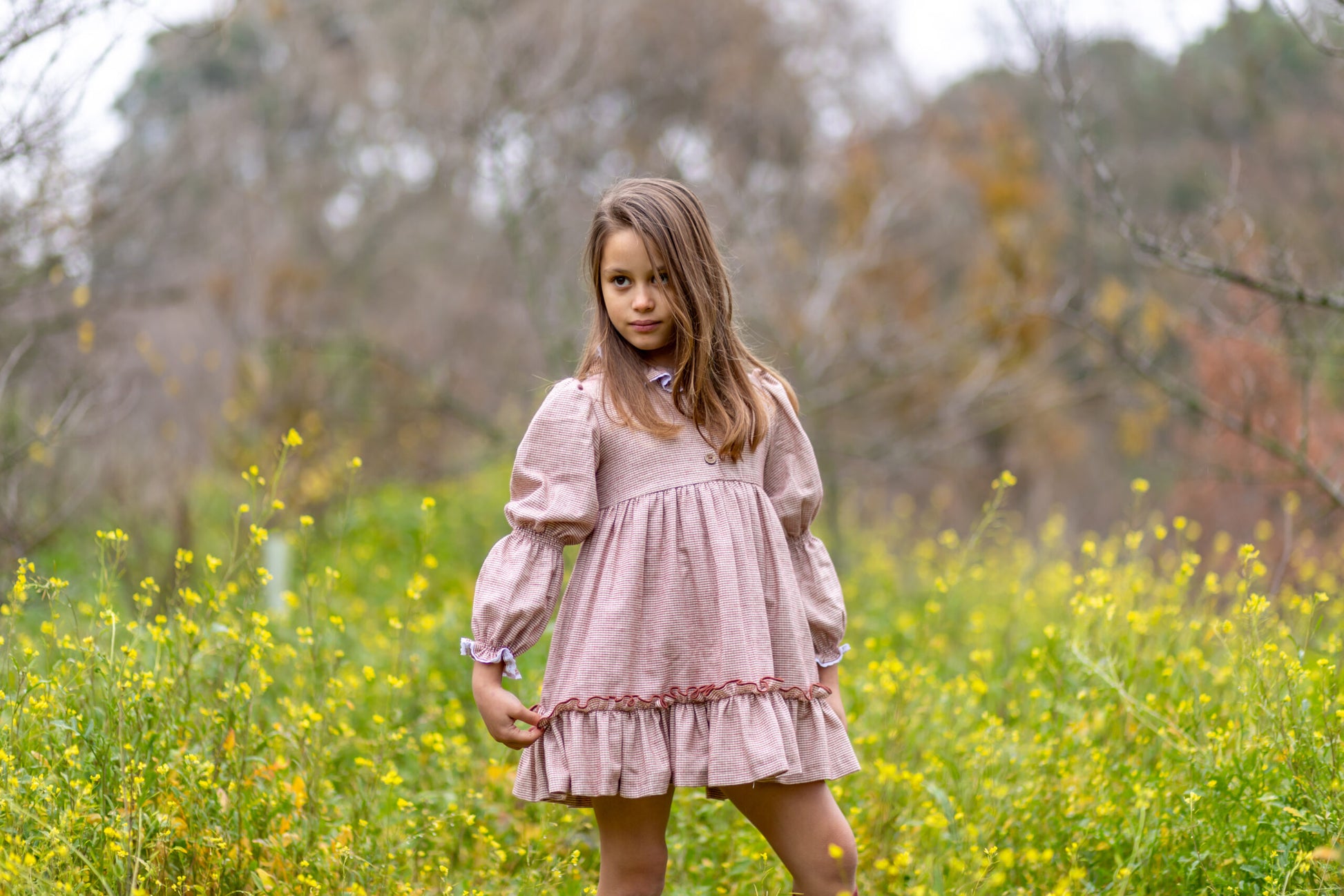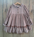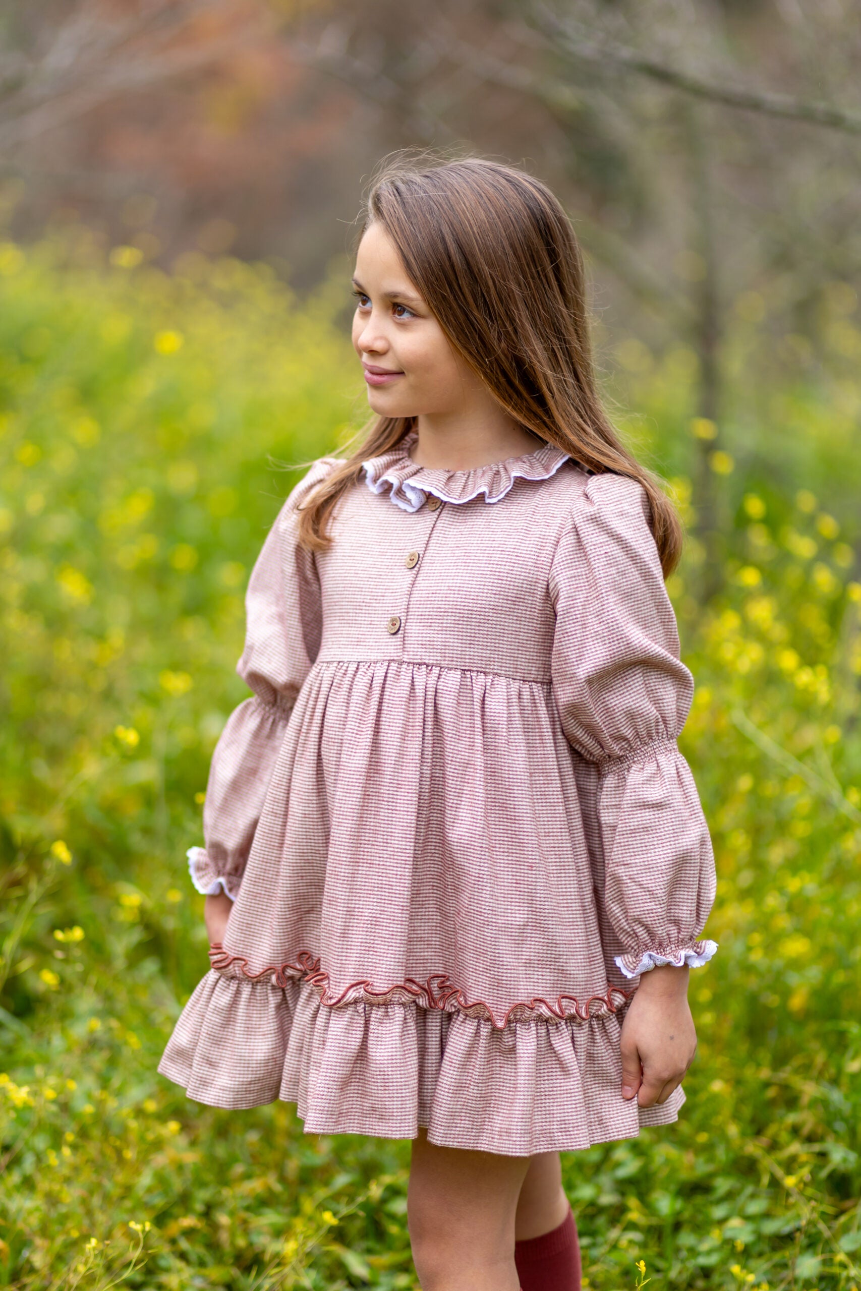 Vestido Telva de Boetiekids, en cuadrito vichy color caldera con cuello de volante y manga larga fruncida en muñeca, va rematdo con gran volante en la parte inferior. Una autentica maravilla